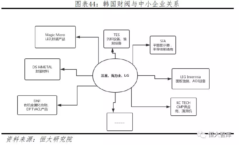 在财阀攻克后,韩国对半导体的热情高涨,众多中小企业纷纷进入。由于技术、资金等先决条件形成的门栏,这些企业较难突破三大财阀,衍变成为三星、海力士提供材料、设备、副产品加工的产业链结构。韩国半导体市场形成核心技术创造、上游设备材料供应、海外终端需求的完整链条。