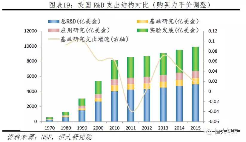 资金支持力度上,美国保留了自二战以来对基础研究支持的传统。从研发支出结构来看,除全球金融危机时期,美国基础研究投入以较为稳定速度增长,且逐渐追平应用研究投入,占总研发支出的16.86%,而中国这一数字仅为5.45%。除了每年美国国家科学基金会固定投资的几项基础项目外,美国先后投入十数亿美金实施“超越摩尔定律的科学与工程”(SEBML)、“国家纳米技术”(NNI)等计划以维持自身在全球范围内的领导地位。
