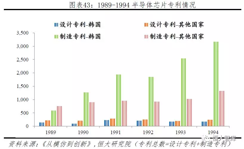 期间,韩国芯片专利数量从1989年的708项激增到1994年的3336项,是其他国家总和的2倍之多,其中三星拥有2445项,现代拥有2059项。