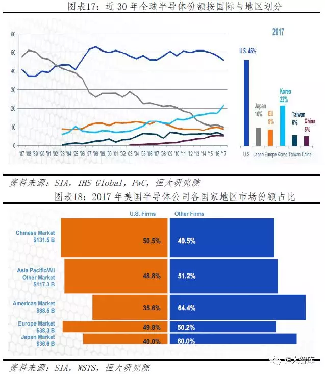 作为技术的发源地,美国一度领导全球半导体与集成电路的发展。据数据显示,美国半导体销售额以平均5.02%增速从1997年的709亿美金增至2017年的1889亿美金。除了1986-1991年期间被日本赶超全球公开销售市场份额一度跌至35%,美国市场占比基本维持在50%,处于世界第一,且在中日美欧等国家均占据重要地位。