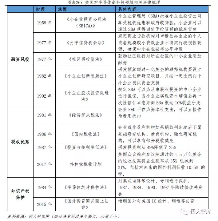 注重法律保护的美国,在半导体方面实施了多项政策贯穿全程,直接或间接的影响半导体行业在融资、投资、税收、专利保护、科技研发等方面的进程。形式可分为减免所得税、企业低税率、额外费用减扣、亏损结转、所有权保护、打击恶性竞争等。