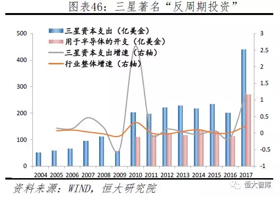 在政府基金、公司其他产业经营等支援下,韩国对半导体的投资逐年加大,即使全球半导体行业在09年金融风暴下不景气也持续加大投资力度。通过“投资-扩大生产-影响芯片价格”,韩国挤走众多竞争企业实现市场份额的进一步扩大。且因为2017年芯片价格的提升,三星反超英特尔成半导体第一企业。