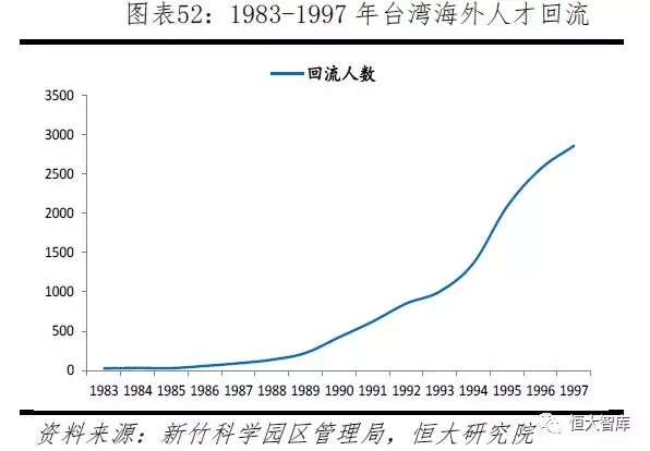 为了加强工研院影响能力、调整岛内经济结构,台湾当局1976年筹建以半导体为核心的新竹科技园区,并于1980年完成。首先,新竹园区从产业多方面吸引高科技企业来园区发展。管理方面,通过《科学工业园区设置管理条例》等进行专项规划管理;税收方面,园区规定新办企业在9年内可任选连续5年免征所得税,5年后每年营业所得税不超过20%;风投方面,开设政府“开发基金”,从1985到1990年共划拨24亿新台币设立种子基金,也鼓励例如宏大风险基金的民间投资。其次,发挥地理优势加强信息技术沟通、互相竞争来提高台湾整体核心竞争力。这点在台积电、联华电子、宏基等台湾半导体领头厂商驻入后愈发明显,从某个企业单纯的代工模式到产业链全环节分布,形成联合生产群。第三,海外人才的吸引、高校的合作提供丰富人才储备。海外人才方面,台湾当局1985年在硅谷设立办公室,监测学习先进技术的同时召集华裔工程师,台积电创始人张忠谋正是以此被请回台湾。1983-1997年,海外人才以平均42%增速回到台湾,得益于此,这段时间的台湾制程技术不断提升。高校方面,与台湾清华大学、台湾交通大学、台湾电子技术研究院、中华工学院等众多大学和研究机构合作,为新竹园区培养了一大批储备人才。
