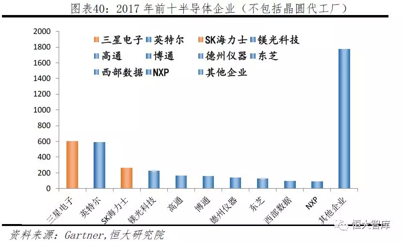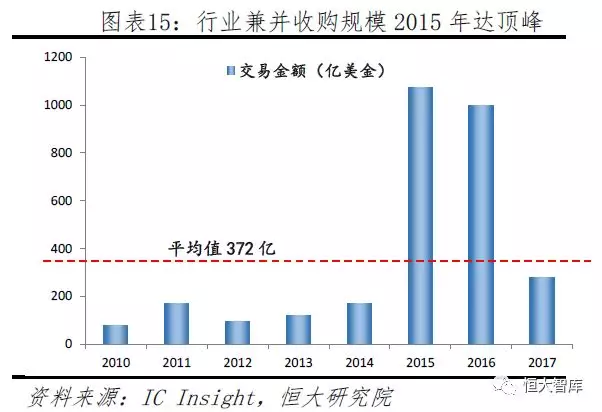 2)大规模兼并收购带来细分领域的龙头效应,议价能力增强。为了保障企业技术水平、研发进度领先,并拥有一定的市场份额,半导体自2000年开始进行一定规模的兼并收购,整体交易金额在2015年达至顶峰为1073亿美金。大量高频的行业并购降低制造商与供应商数量的同时,使“强者越强”。而2017年的并购行为放缓也侧面说明,行业的成熟令各自领域的龙头效应明显,更多的并购已无法带来更好的边际效益。