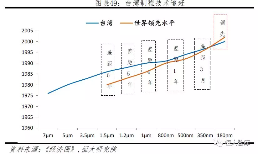 3)建立工研院,实行技术指引与组织交流职责。1974年台湾效仿美国硅谷产学研模式建立电子工业研究中心,即工研院的前身。工研院主要职能为领头规划,加速人才与技术流通。此外,工研院还担任最新技术研发工作,例如1975-1979第一期专案计划的CMOS技术、1983-1987超大集成电路计划的1-1.5微米制造与封测技术等。通过自身技术研发或引进,实现生产能力后再转让给民间其他企业,提高台湾整体半导体技术。最重要的是,工研院还扮演孵化器角色,台湾第一家设计与制造公司联华电子(1979年)、全球最大晶圆代工厂台积电(1987年)、第一家8英寸生产线世界先进半导体公司(1994年)等均由工研院分衍出来。