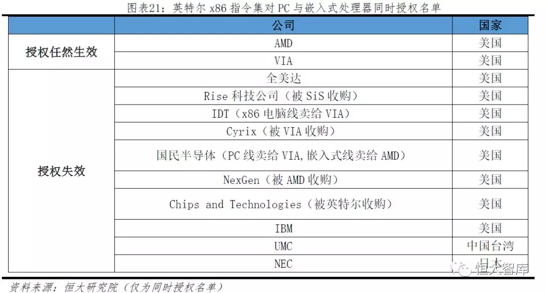 以英特尔为例,Wintel(Windows+Intel)模式占据pc时代市场半壁江山,尽管影响逐渐下降,但对众多厂商造成的挑战始终存在。主要原因在于英特尔对指令集与微架构的长期统治。指令集(Instruction Set Architecture,ISA)为转化操作任务成CPU(中央处理器)可以理解的底层代码的一项硬程序,这一过程又叫做编译(compile)。微架构(microarchitecture)即设计者对芯片处理频率、运输速度、耗能水平等的体现,拥有微架构设计能力也等于拥有CPU自主知识产权。以书本比喻,微架构能力是作者整体绘图写作、思想意图的体现,而指令集是为不同国家读者按照一定标准的翻译器,通过这些过程,全球读者才能阅读到这本书。同一本书可以按照不同标准来翻译,因此出现了不同的指令集,最为著名的是英特尔x86、ARMv8、MIPS等。同理,一种翻译标准也可以翻译不同种类的书形成不同微架构,其中以低耗能ARM(英国公司)Cortex与高性能英特尔Core系列为主。