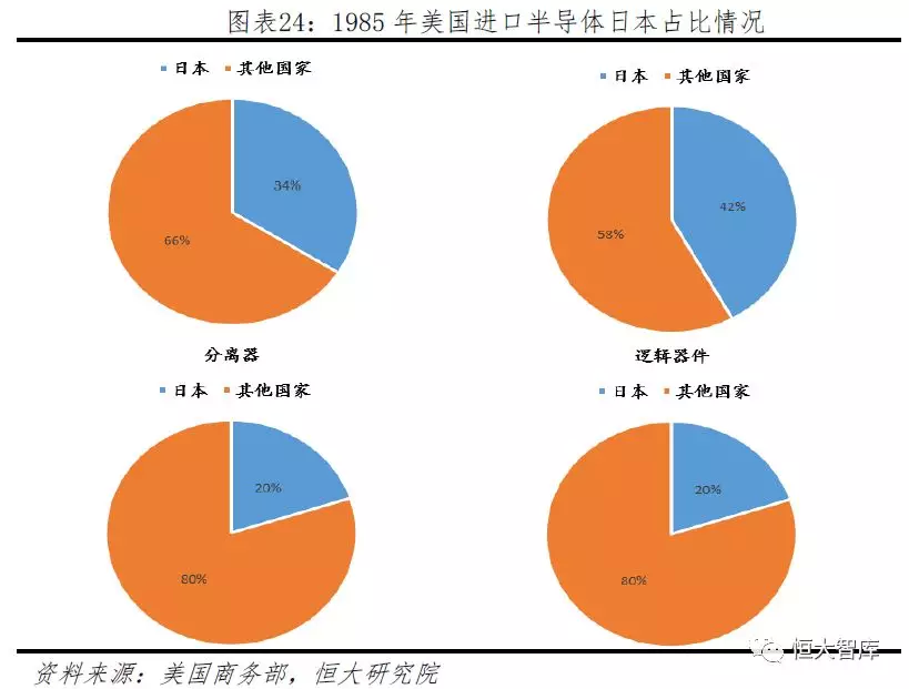 双边协议签订背景是日本抢走部分高科技领域而引发美国对自身发展的担忧。美日双边协议取消日本贸易壁垒扩大市场、同时遏制对手发展。80年代前全球销量最高半导体公司被美国所垄断,包括国民半导体、德州仪器、摩托罗拉等,到1986年全球前十公司有6所来自日本,前三强更是易主为日本电气、日立、东芝。为此,联邦政府开始在1985年与日本进行谈判,以“反倾销”名义令日本政府调整产业政策,主要要求为1)至1991年底,非日本企业生产的半导体器件与芯片在日本销量必须占日本市场总销量的20%(之前日本政府保护下为10%以下);2)禁止日资在美投资并购;3)建立价格监督机制,禁止第三国反倾销。从出发点与申诉点来看,都与今年中美贸易战有所相似,但不同的是,依赖美军保护与国防需求,日本在1986年签订了协议。由于当时众多美国企业为区别日本低价竞争,转向ASIC(某种特殊目的的定制芯片)等高技术高附加值市场,双边协议带来的效益不算很大。协议过后,日本全球市场份额与DRAM市场份额变动不大,依旧处于美国之上。对此美国于1989年再次与日本签订贸易协议,条款扩大至专利保护与专利授权等,对此,日本不得不令本国企业开始采用美国框架与产品。数据显示,1996年非日企业半导体产品在日本市场份额升至30%,其中75%来自美国。