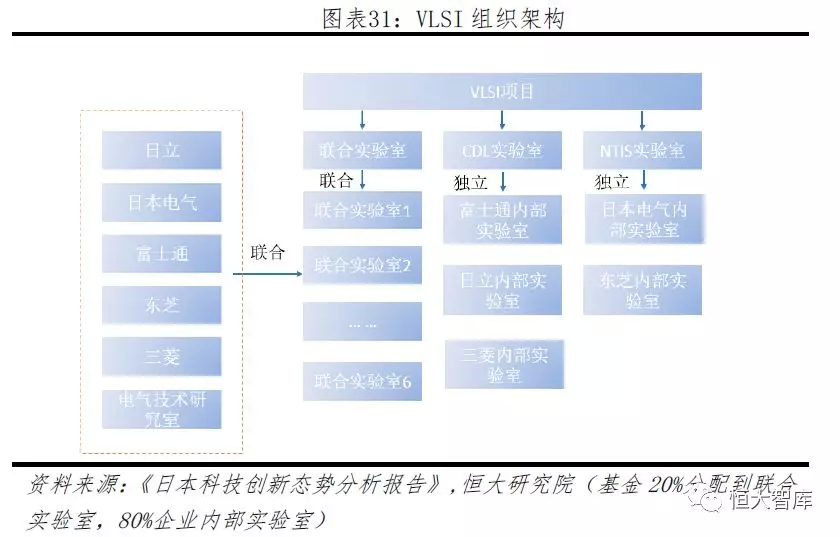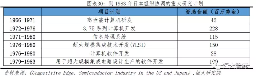 1)集合资源,整体规划,统一认识。不同于美国半导体企业大多单纯从事集成电路或者其他电子领域,日本企业大多有另外产业,整体规划稍显混乱,例如东芝的家电事业部、精工的腕表事业部、索尼的相机事业部等。进入到“轻薄短小”发展时期(早期是以钢铁煤炭为代表的“厚重生长”到70年代电子半导体“轻薄短小”),以通产省为代表的日本政府,发挥了资源与资金协调、加强企业与政府之间信息沟通与调整产业发展方向的作用。例如,为了解决IBM 370系统及1M存储器进入日本市场后带来的压力,通产省联合日本电气、日立、富士通和东芝五家企业在1976年组成为时4年的超大规模集成电路项目(VLSI),总投资2.36亿美金,其中政府出资45%。VLSI主要分为五家企业共同研发的基础共性技术与内部单独研发技术两条不同线路,目标为10年内提升DRAM技术,包括短期64K与256K与长期1M目标并实现量产。1980年VLSI计划宣布结束时,共获500多项联合专利与1200多项工业专利,极大的提升日本整体集成电路水平,也为日本在80年代以DRAM为切入点成为世界第一强国奠定技术基础。从该项目可以看出,虽然项目研发还是以企业为中心,但是政府在联合研究基础共性技术方面发挥带头与协调作用,并在专利保护、研发成果免费向成员公司转移等方面促进了知识高效流动。