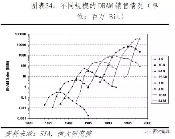 得益于计算机的发明和普及,储存技术迅速发展,在摩尔定律下约每3年对DRAM需求翻倍。经过类似VLSI等项目发展,日本64K DRAM研发进度与IBM、德州仪器等美国公司持平,到了1985年256K DRAM研发进度赶超美国,日立与富士通率先量产上市。日本抓住大型机对基础存储技术的需求,以DRAM为切入点将日本半导体影响力辐射到全球。
