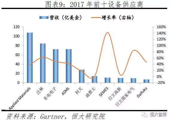 设备方面,2017年全球设备共投资566亿美金,韩国以179.5亿美金首次超越台湾成为全球设备花费最高国家,主要原因在于今年存储器的暴涨带动DRAM相关产业链增长,韩国作为DRAM产出第一国家的收益最高。中国大陆以27.4%增速展现对制造环节的投资热情,排全球第三。与材料供应市场类似,设备供应市场90%以上被欧美日韩垄断,且前十厂商均有较高的营收增长,其中韩国SEMES以142%增速成为全球涨幅最高供应商。