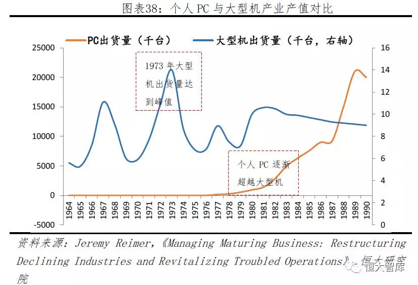日本成功于DRAM,失败也在DRAM领域。沉迷大型机DRAM带来的成功忽略技术的改变,日本固执的将适用于大型机的DRAM技术深入发展,强调芯片的持续性与稳定性。但1980年后个人电脑、互联网等相继推出,以PC、移动手机为代表的消费电子时代到来,此时的芯片强调灵活、处理信息能力强等,并不要求非常长久的稳定性。1973年全球大型机出货量达到顶峰,之后慢慢萎缩而个人PC产值逐渐飙升,日本没有抓住技术需求变化主动进行产业调整,令韩国在同等领域以新技术超越。