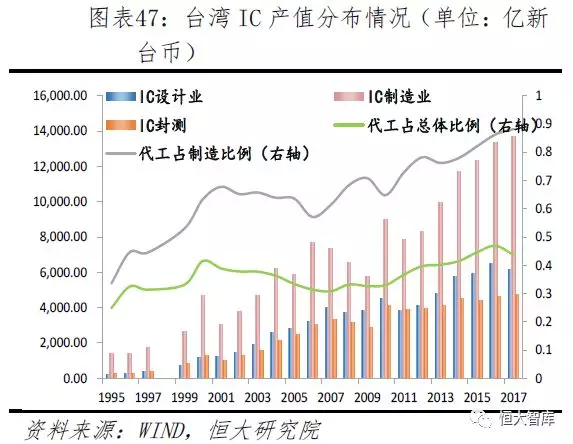 全球代工模式可以迅速获得专利授权并打开市场,错开与美日产业链有效降低与强国的竞争。因此,台湾积极参与代工把产业链延伸到岛内,同时发挥生产成本优势规模经济,成功巩固了全球代工地位。