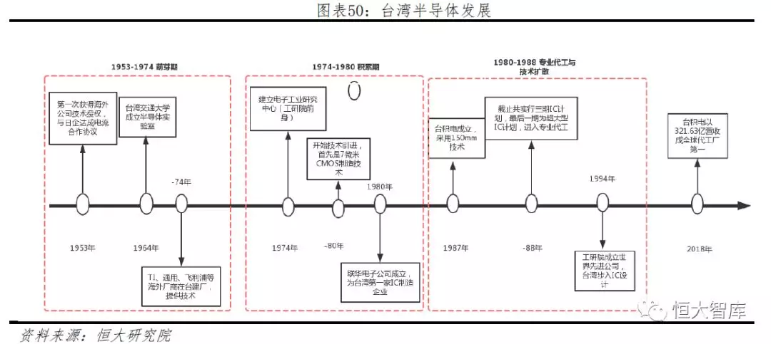 类似韩国的发展路径,台湾依靠早期给在台建厂的美日厂商做基础低端加工起步,积累所需知识与技术。80年代末,抓住美国逐渐转向Fabless模式推行全球纵向分工的机会,将利润不高、投资金额大的芯片制造、封测转进岛内。初期,台湾在设计、制造、测试和封装四个环节都有相应发展,但最终与韩国不同的主要原因在于1)技术始终落后,当时在台的美日厂商愿意授权的仅为封测技术,缺少核心设计环节;2)韩国财阀可以依靠运营其他产业来给半导体行业提供资金支持,但台湾的中小企业仅从事半导体,90年代的两次芯片价格下跌对台湾都造成巨大影响。因此,无领军企业的台湾融资能力与抗压能力次于韩国;3)台积电foundry模式的成功具有意义性质的示范作用,岛内其他企业可以依照台积电复制成功。