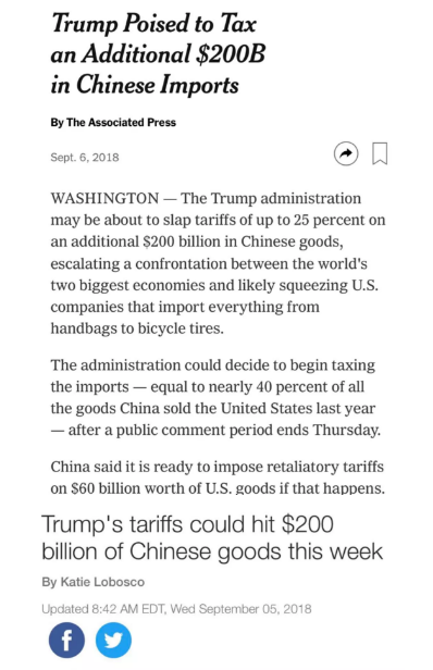 9月6日,美国政府对价值2000亿美元中国商品加征关税的公众意见期结束。根据美国媒体CNN、纽约时报报道,公众意见征询期结束,特朗普政府拟对中采取2000亿美元商品加征关税的提议即可生效。