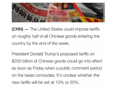 CNN在报道中称,加征10%还是25%,目前尚无定论。根据两家媒体报道,去年美国从中国进口的40%的商品都在此次加征关税之列。