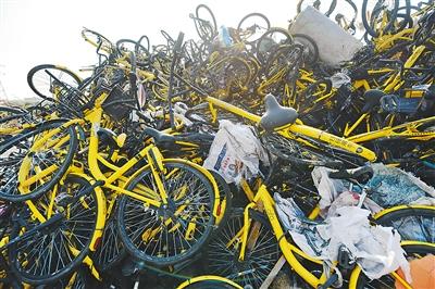 各大城市共享单车投放过多影响了城市交通。图为杭州的一片空地上,由于长时间的存放,大批共享单车与垃圾堆放在一起,加大了处理这些单车的难度。