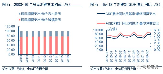 现在以及未来,城镇居民消费仍占据重心,最终消费对GDP贡献保持高位。把居民消费划分为城镇居民消费和农村居民消费,两者占比将维持在8:2,城镇居民消费占绝对比重。最终消费对GDP累计同比的拉动维持在4%的中枢,相比于资本形成总额对GDP累计同比拉动维持在【2%,3%】以及货物和服务净出口维持在【-0.5%,0.5%】占比较大。最终消费对GDP累计同比贡献率维持在70%的中枢更是占据了绝对比重。
