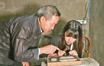 非遗传人吴水根(左)在指导徒弟制作银器。本报记者 史一棋摄