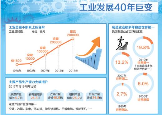 如果按可比价计算,改革开放40年来,中国工业增加值年均增长10.8%,2017年比1978年增长了53倍,很多产业从无到有,200多种工业产品产量位居世界第一。