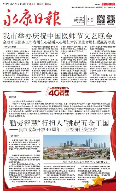 看重“报道节奏”。作为地方媒体,要听指挥、跟节奏,不抢拍、不走调。为此,《永康日报》制定了“副刊版先推出市民故事,时政版综合稿择机刊发,重大稿件推送与央媒同步”的融媒体报道运行方案。截至目前,副刊《身边的变迁》专栏已推出36篇市民来稿,讲述40年亲历巨变故事,社会反响强烈;8月20日,时政版一版推出《庆祝改革开放四十周年》专栏。开篇报道《勤劳智慧“行担人”挑起五金王国》,打破常规排版,图文并茂,叙事宏大,主题鲜明,得到上级主管部门的表扬。