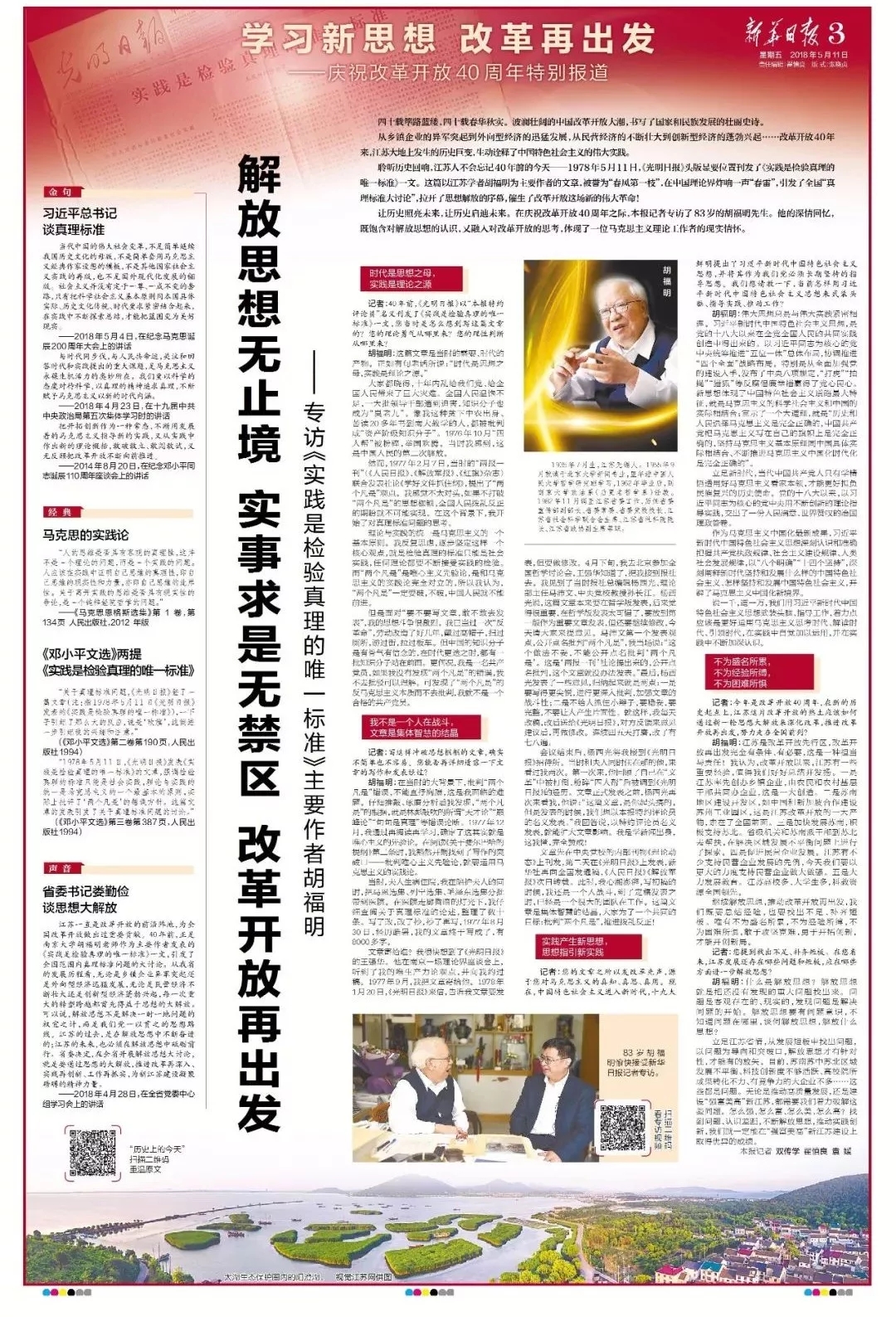40年后的5月11日,《新华日报》以头版中心位置导读加一个整版的篇幅,推出了由新华日报社社长、总编辑双传学带队对胡福明同志的专访《解放思想无止境 实事求是无禁区 改革开放再出发》,新华报业传媒集团旗下报网端微全媒体矩阵同步推送。由此,新华报业庆祝改革开放40年大型全媒体行动正式启动。