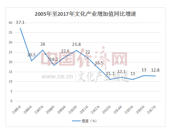 魏鹏举:从国家统计局连续10多年发布的数据来看,进入“十三五”以来,文化和相关产业的增速相对放缓,从此前平均增速超20%,降至这几年的12%左右(2014年12.1%,2015年为11%,2016年为13%,2017年12.8%,中国经济网文化产业频道注),这主要与我国宏观经济转型有关。随着我国经济从高速增长向高质量发展阶段的转变,传统工业制造业的增速明显放缓,由此也直接影响到文化产业的整体增速。
