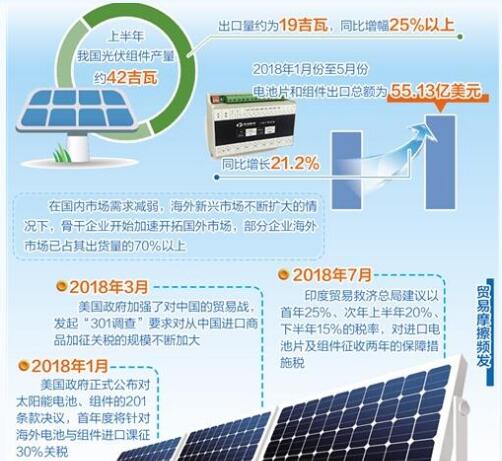 中国光伏行业协会提供的数据显示,上半年我国光伏组件产量约42吉瓦,出口量约为19吉瓦,同比增幅25%以上;2018年1月份至5月份,电池片和组件出口总额为55.13亿美元,同比增长21.2%,2012年至2016年该出口额一直处于下滑态势。