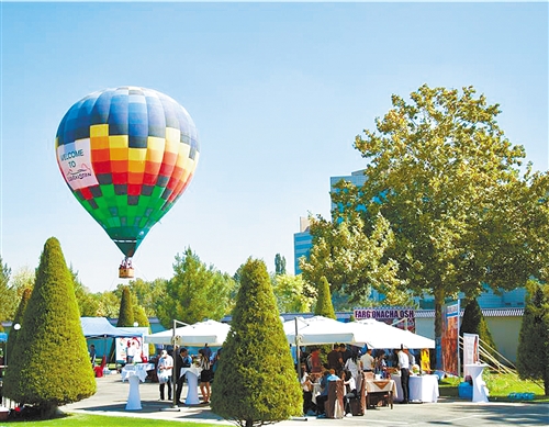 写有“欢迎来乌兹别克斯坦”标语的热气球飘扬在旅游展场馆上空。 李遥远摄