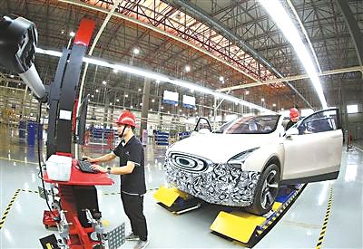 各地着力发展汽车产业区域经济。2016年4月江西赣州打造新能源汽车科技城,建成后可承接年产80万辆以上整车的产能,到2025年产业链核心企业超百家。图为入驻科技城的昶洧新能源汽车有限公司工人正在测试纯电动汽车。