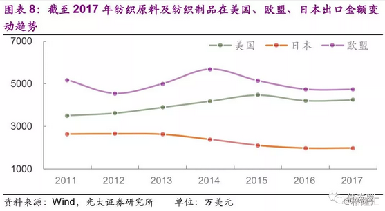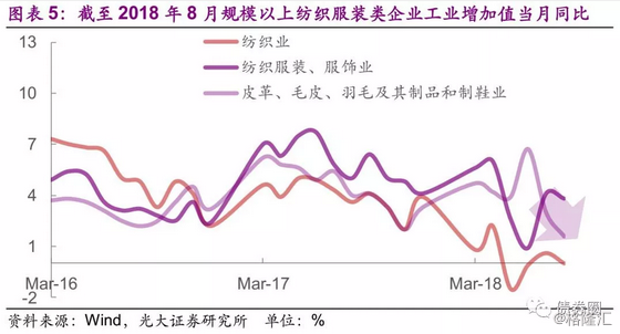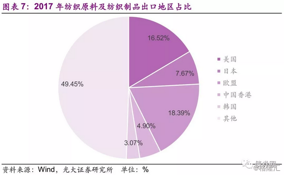 外需方面,我国是世界上最大的纺织品出口国,2017年以来纺织品出口有所回暖,然而受制于中美贸易摩擦升级的影响这一趋势将受到抑制。
