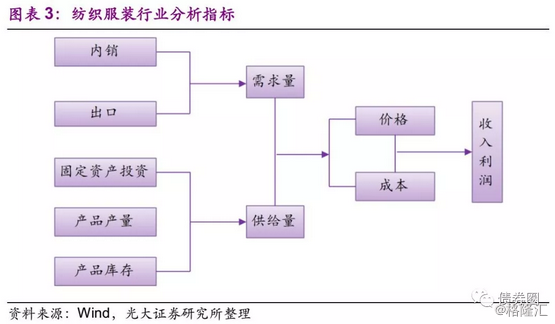 考虑到上游植物、动物性纤维更多涉及农业生产,化纤与化工行业产品可比性更强,我们主要讨论产业链中游纺织制造产业链和下游服装制造产业链。