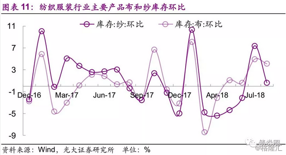 产量方面,布和纱的产量均有所下滑,2018年8月份布和纱当月产量同比均为负值,同比分别增长-0.9%和-1.1%。库存方面,2018年8月份布和纱库存环比亦下滑。