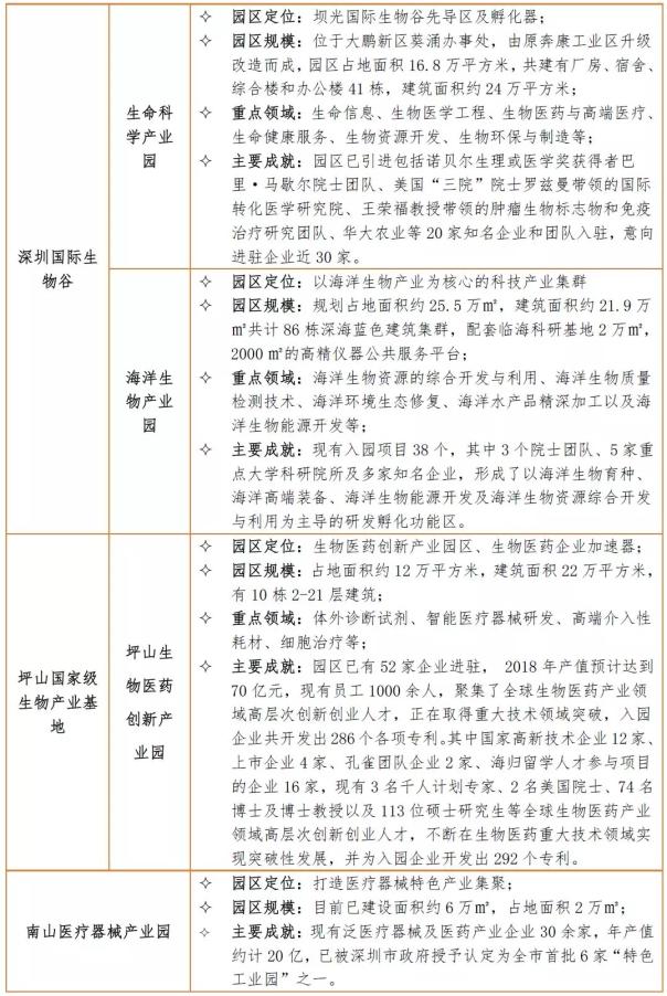 自2005年深圳被国家发展改革委认定为第一批国家生物产业基地以来,深圳加大政策扶持力度,推动产业要素集聚,生物产业以年均20%的增速快速发展,培育了坪山国家生物产业基地、国际生物谷两大生物医药产业集聚区,在基因检测、生物信息、医学影像等细分领域优势突出,培育了华大基因、迈瑞医疗等一批我国生物医药领域细分专业自主创新的龙头企业,建成了各类创新载体319家,生物医药产业正在成为深圳市经济增长的新动力。