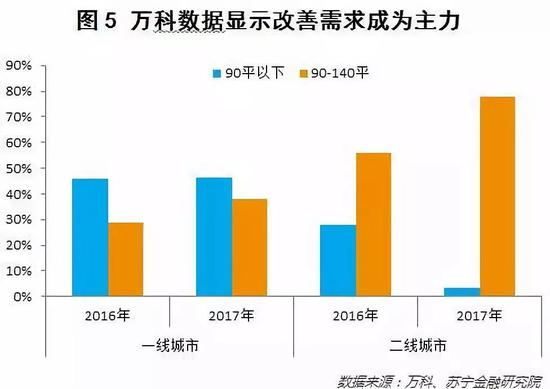 4.来看一组更扎心的数据:由万科提供。二线城市改善型换房大面积需求呈压倒性比例,尤其是2017年。这一轮资产膨胀后,中产的分水岭已经出现。