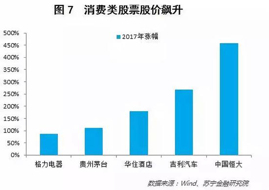 5.2017年如下的消费类股票飞涨。尤其是贵州茅台。飞天茅台在狗年到来之际,又涨了200元一瓶,依然难当脱销之势。为什么?对应的是资产膨胀的获利者的消费兑现。他们的酒桌上多了更多的茅台;得益于改善型住房需求,电器的消费亦非常强劲(体现为去年白色家电股票飞升,但今年下半年的股市表现已经彻底脱离业务面,无法参考)