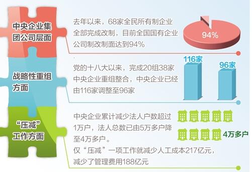“近年来改革进展是明显的,成效是显著的。”彭华岗用多组数据予以说明。比如,关于公司制改制,去年以来,中央企业集团公司层面68家全民所有制企业全部完成改制,目前全国国有企业公司制改制面达到94%。在战略性重组方面,党的十八大以来,完成20组38家中央企业重组整合,中央企业已经由116家调整至96家。在“压减”工作方面,中央企业累计减少法人户数超过1万户,法人总数已由5万多户降至4万多户,力度之大前所未有,仅“压减”一项工作就减少了人工成本217亿元,减少了管理费用188亿元。