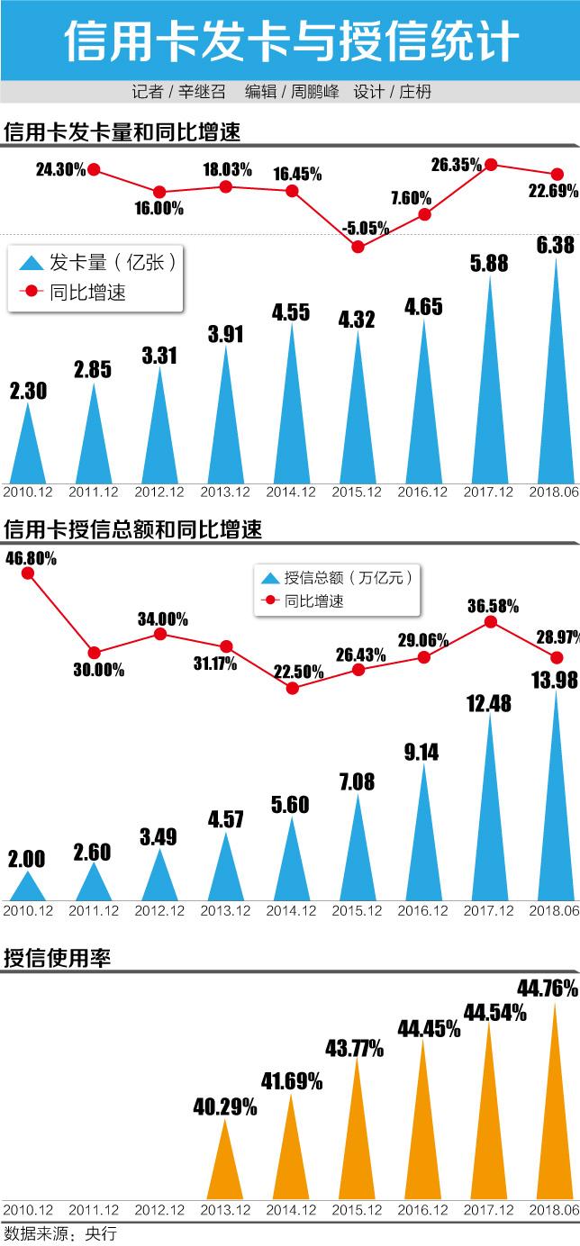 其中,截至2018年6月末,银行卡应偿信贷余额为6.26万亿元,较2017年6月末增长33.48%,自2017年以来保持30%以上的增速。不过,多家银行将信用卡作为车贷业务载体。截至6月末,信用卡卡均授信、授信使用率(应偿信贷余额与银行卡授信总额之比)自该数据2013年公布来稳步上升。银行卡卡均授信额度2.19万元,授信使用率44.76%。信用卡逾期半年未偿信贷总额756.67亿元,占信用卡应偿信贷余额的1.21%。