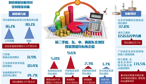 在政策的带动下,前三季度,东、中、西和东北地区投资增速均有所企稳。其中,东部地区投资同比增长5.8%,增速比前8个月提高0.1个百分点;中部地区投资增长9.6%,增速提高0.4个百分点;西部地区投资增长2.3%,增速提高0.1个百分点;东北地区投资增长1.7%,增速与前8个月持平。