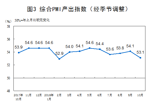 2018年10月份,综合PMI产出指数为53.1%,比上月回落1.0个百分点,表明我国企业生产经营活动延续扩张态势,但增速有所放缓。