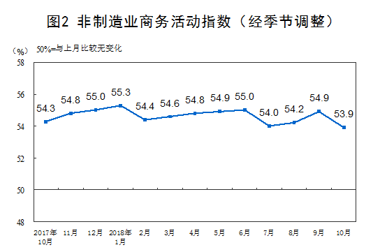 2018年10月份,中国非制造业商务活动指数为53.9%,比上月回落1.0个百分点,表明非制造业继续保持增长态势,增速有所放缓。