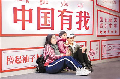 此情此景,正是“中国有我”的真实写照。这几个大字就挂在几米外的墙上,许多人专门跑去合影。
