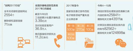 为更加精准打击网络侵权盗版,国家版权局等单位连续开展“剑网行动”,仅“剑网2017”就关闭侵权盗版网站2554个,删除侵权盗版链接71万条。工信部积极开展电信网络诈骗治理,截至今年8月,累计处置诈骗电话3.39亿次,及时劝阻受害用户36.9万人,挽回直接经济损失达11.2亿余元。“净网”“秋风”“护苗”等系列专项治理行动,使危害网络诚信的多种违规违法行为得到有效遏制。