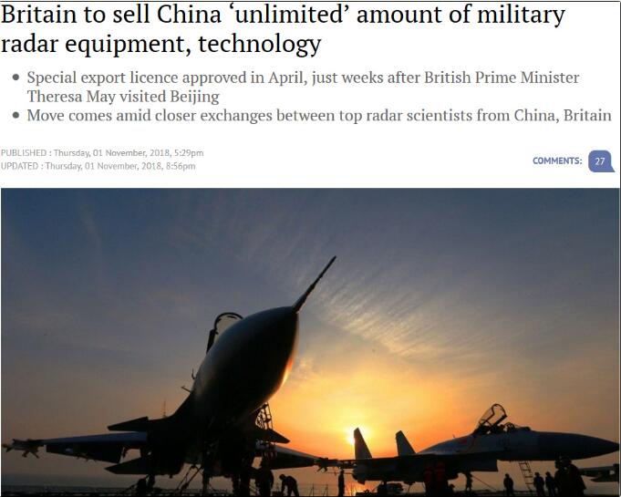 《南华早报》1日援引英国国际贸易部的信息称,这笔数量不设上限的交易将可能包括:解放军空军用于目标捕获、武器控制和对抗系统的军用雷达设备、零部件、软件和技术。
