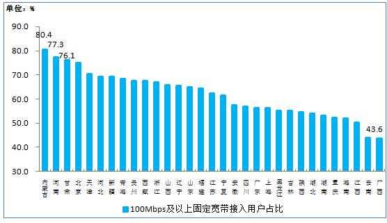 图12 100Mbps及以上固定宽带接入用户占比各省分布情况