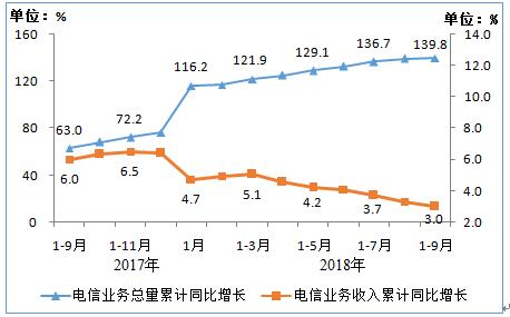 电信业务收入增速持续回落。前三季度,电信业务收入累计完成9915亿元,同比增长3%;电信业务总量①完成43671亿元,同比增长139.8%,增速逐月提升,9月当月增速达144.2%。