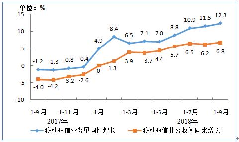 移动短信业务量和收入保持增长态势。服务登录和身份认证等服务的普及,使企业短信业务量今年以来保持大幅提升的态势,前三季度,全国移动短信业务同比增长12.3%(去年同期同比下降1.2%);移动短信业务收入完成287亿元,同比增长6.8%(去年同期同比下降4%),增速从今年开始保持正增长态势;移动彩信业务量同比下降14.0%。
