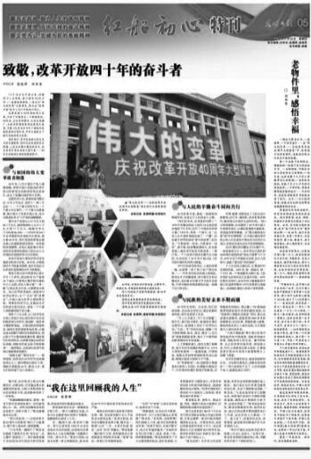 11月22日,《光明日报》以《致敬,改革开放四十年的奋斗者》为题推出特刊。特刊中用一个个改革开放的关键节点与地标,为读者生动讲述着40年来中国从“赶上时代”到“引领时代”的伟大跨越。在文章结尾记者写道:“伟大变革始于足下,人民幸福源于奋斗,砥砺奋进正当时!”更是让报道有了更多延伸与愿景。