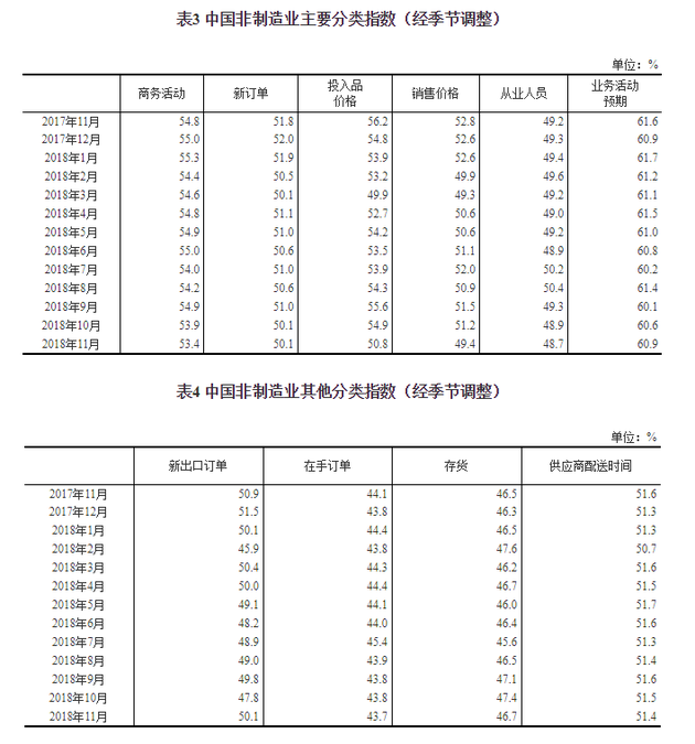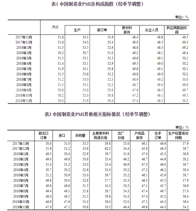 11月30日上午,国家统计局公布2018年11月中国采购经理指数运行情况,数据显示: