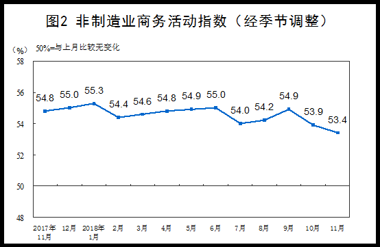 2018年11月份,中国非制造业商务活动指数为53.4%,比上月回落0.5个百分点,仍在扩张区间;