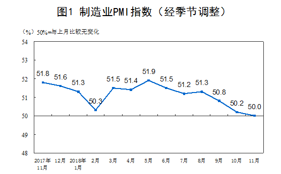 2018年11月份,中国制造业采购经理指数(PMI)为50.0%,比上月小幅回落0.2个百分点,处于临界点;